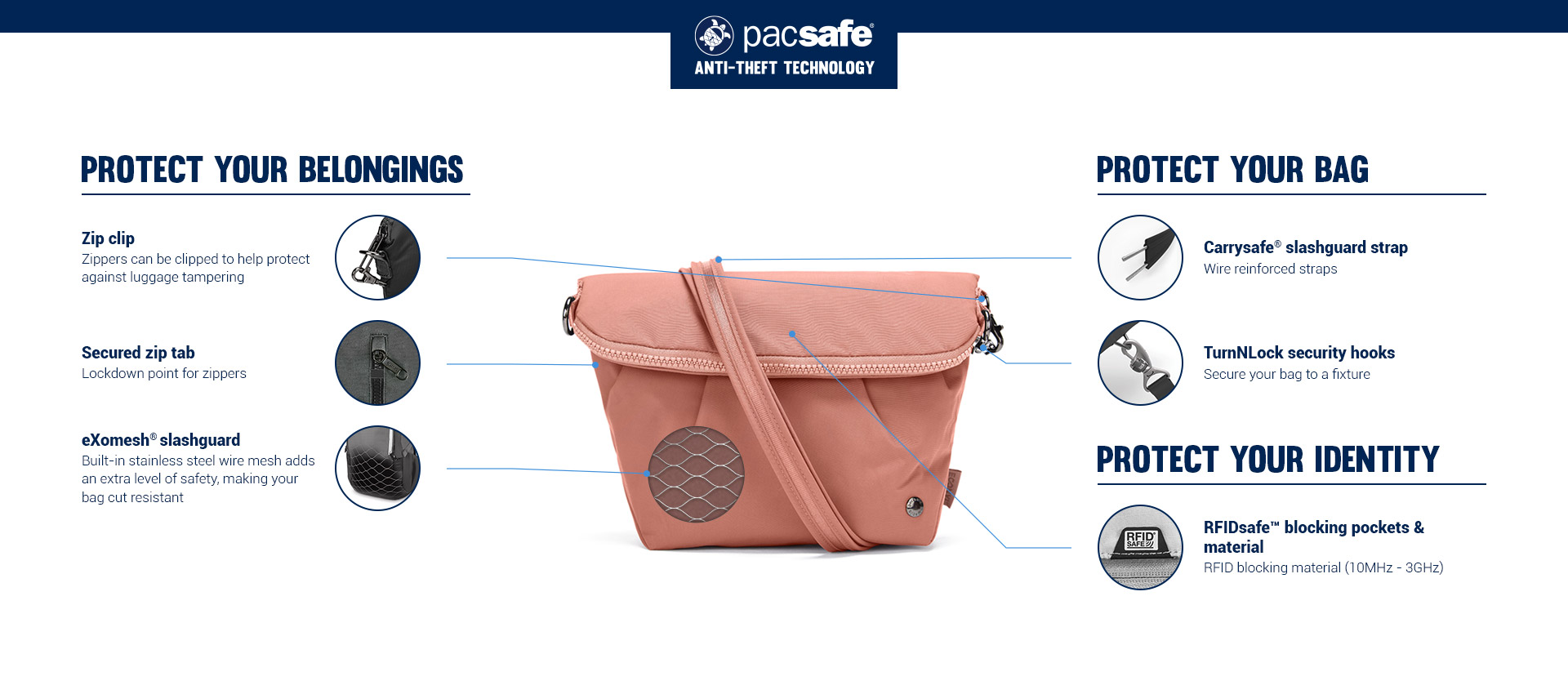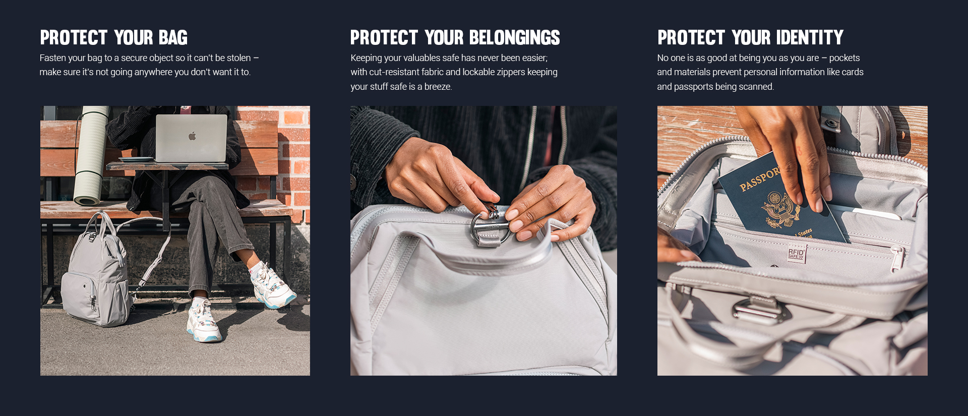- Cut-resistant anchor strap secures around a fixed object to protect your bag