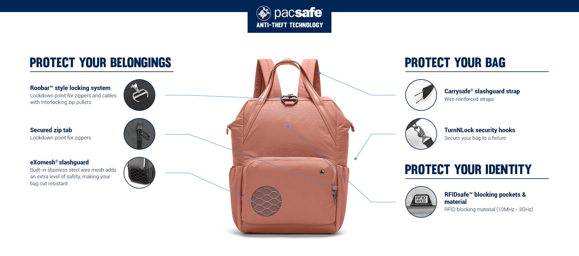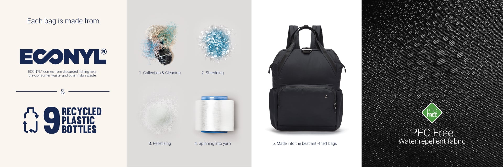 Our best-selling women’s anti-theft bag now in ECONYL® regenerated nylon. Ultra-chic, versatile and practical, the spacious Citysafe® CX 17L Backpack has space for a 16” laptop, offers smart organisation for your things, and protects your valuables with security that blends into the stylish design.